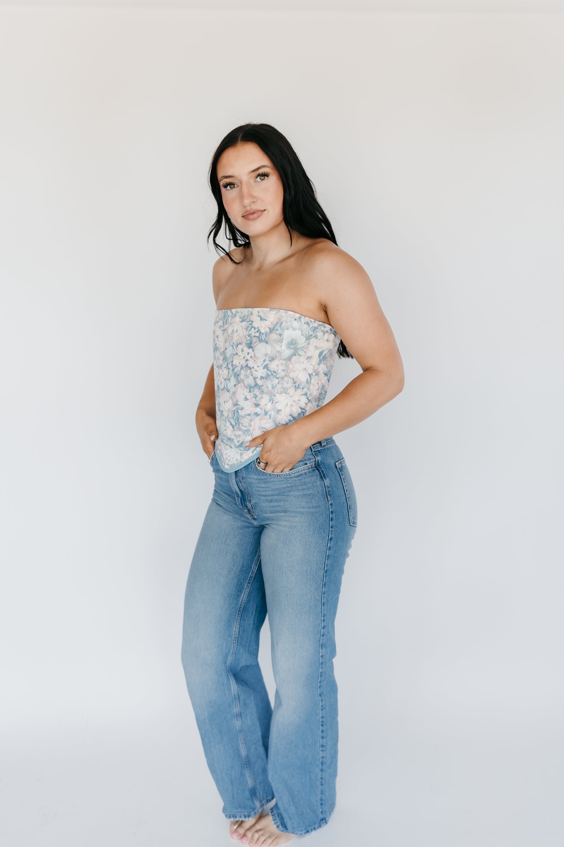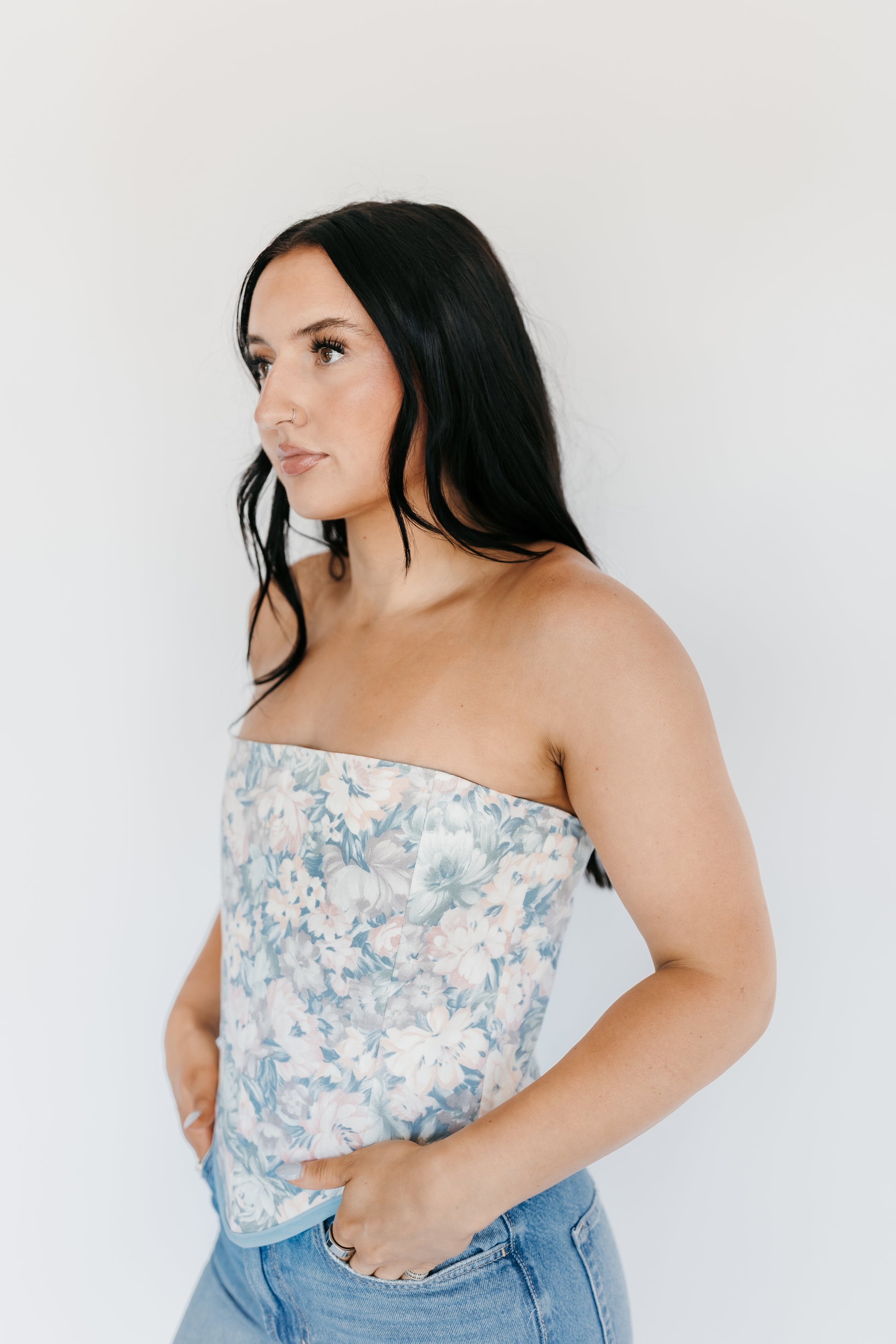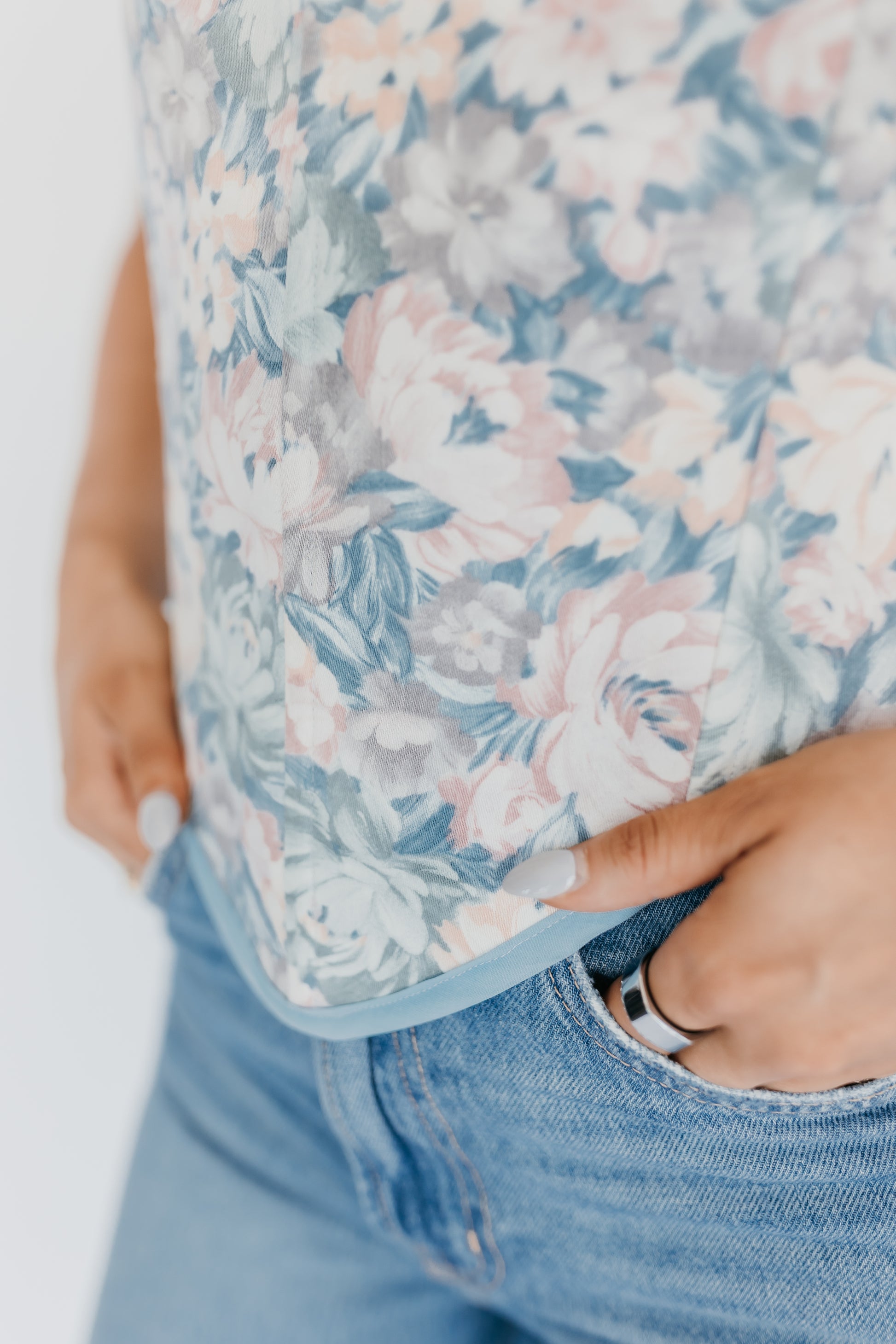 Straight across neckline with the perfect blend of colors and florals | U-shaped bottom to be tucked in or layered over pants.