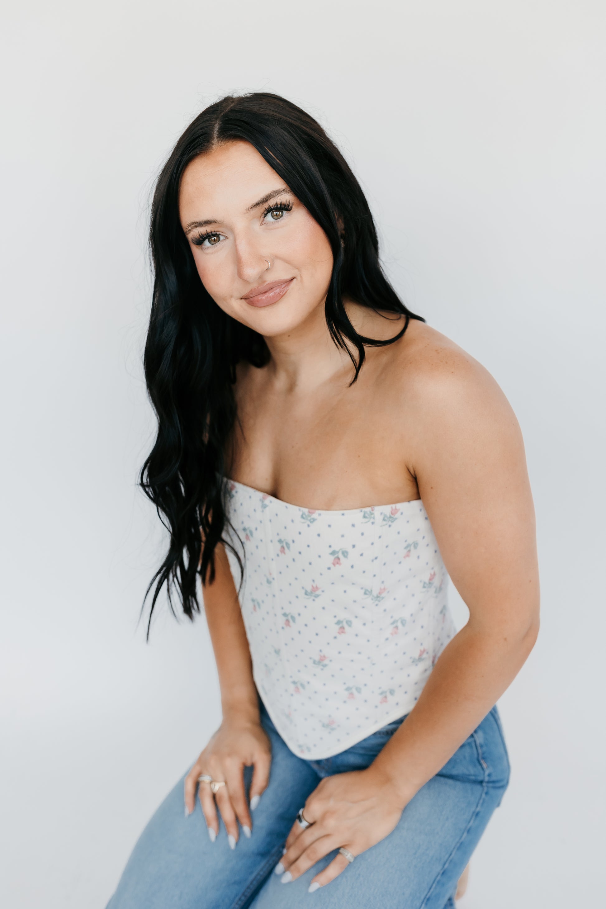 Straight across neckline with small floral details and base neutral color | U-shaped bottom to be tucked in or layered over pants.
